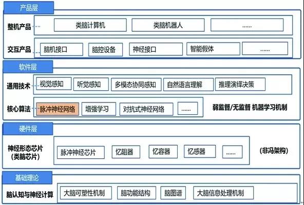 類(lèi)腦智能技術(shù)體系分四層:基礎(chǔ)理論層、硬件層、軟件層、產(chǎn)品層;A(chǔ)理論層基于腦認(rèn)知與神經(jīng)計(jì)算,主要從生物醫(yī)學(xué)角度研究大腦可塑性機(jī)制、腦功能結(jié)構(gòu)、腦圖譜等大腦信息處理機(jī)制研究;硬件層主要是實(shí)現(xiàn)類(lèi)腦功能的神經(jīng)形態(tài)芯片,也就是非馮諾依曼架構(gòu)的類(lèi)腦芯片,如脈沖神經(jīng)網(wǎng)絡(luò)芯片、憶阻器、憶容器、憶感器等;軟件層包含核心算法和通用技術(shù),核心算法主要是弱監(jiān)督學(xué)習(xí)和無(wú)監(jiān)督學(xué)習(xí)機(jī)器學(xué)習(xí)機(jī)制,如脈沖神經(jīng)網(wǎng)絡(luò)、增強(qiáng)學(xué)習(xí)、對(duì)抗神經(jīng)網(wǎng)絡(luò)等;通用技術(shù)主要是包含視覺(jué)感知、聽(tīng)覺(jué)感知、多模態(tài)融合感知、自然語(yǔ)言理解、推理決策等;產(chǎn)品層主要包含交互產(chǎn)品和整機(jī)產(chǎn)品,交互產(chǎn)品包含腦機(jī)接口、腦控設(shè)備、神經(jīng)接口、智能假體等,整機(jī)產(chǎn)品主要有類(lèi)腦計(jì)算機(jī)、類(lèi)腦機(jī)器人等。