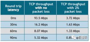 •丟包率為2%時(shí),TCP吞吐量比無(wú)數(shù)據(jù)包丟失低6到25倍。