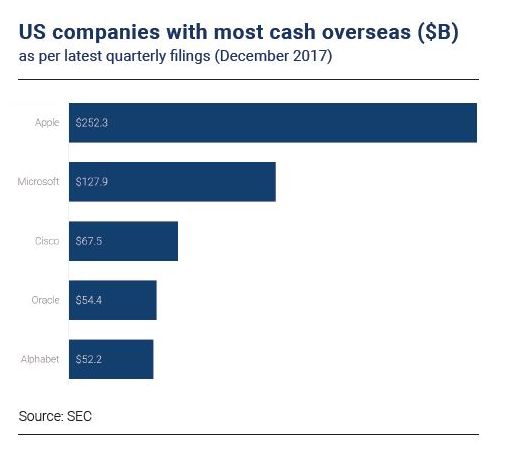 特朗普剛簽署的美國新稅收計劃將使得美國公司能夠以15.5%的稅率從海外市場返回(美國)國內。對于像蘋果、甲骨文、Alphabet和微軟這樣的現(xiàn)金豐富的高科技公司,此舉意味著能夠從國外回流數(shù)十億美元的資金。